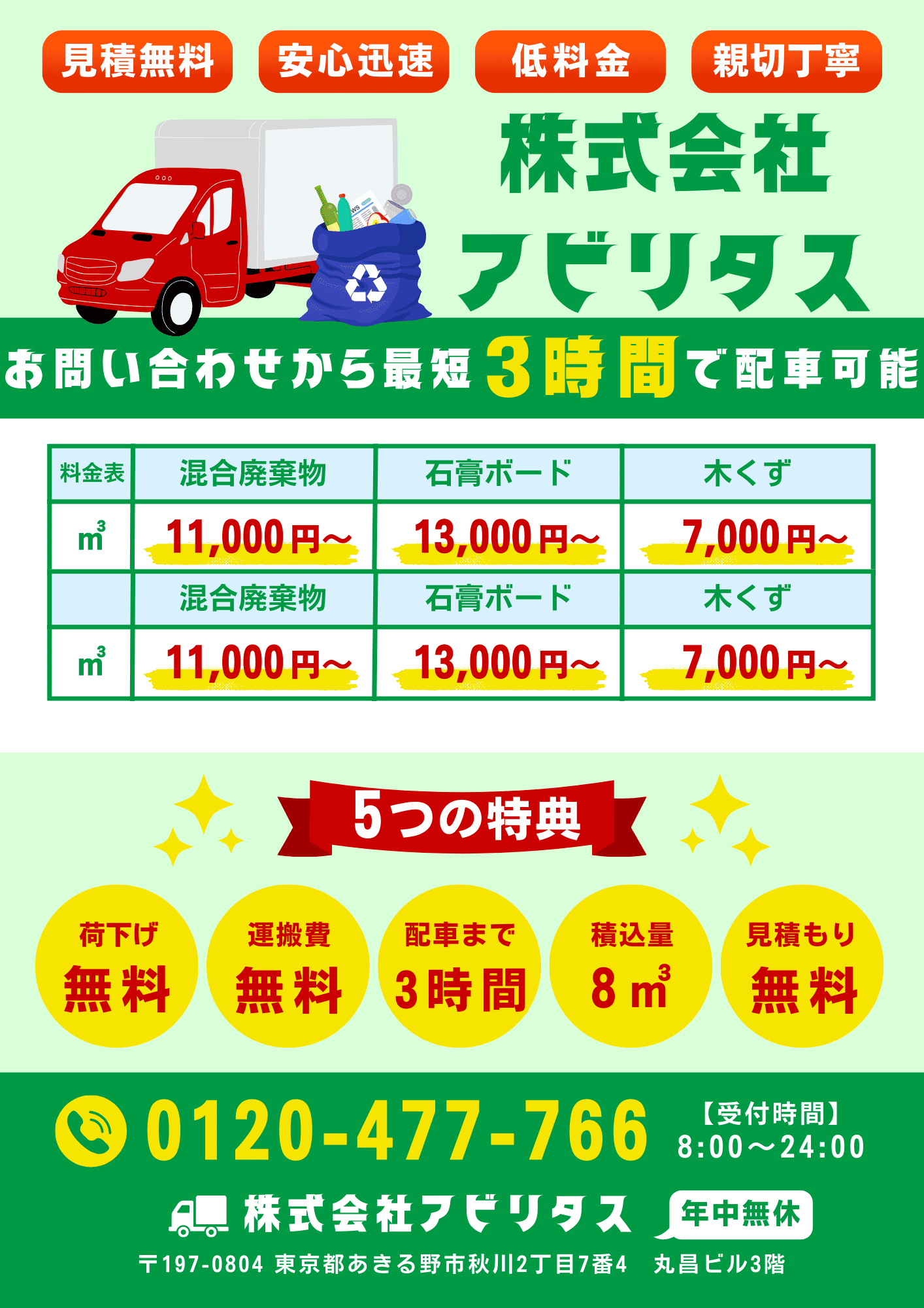 通常よりも多少料金がかかってでも、今日までに処理してほしい。現場作業の猶予期間がなく早く処分したい。
